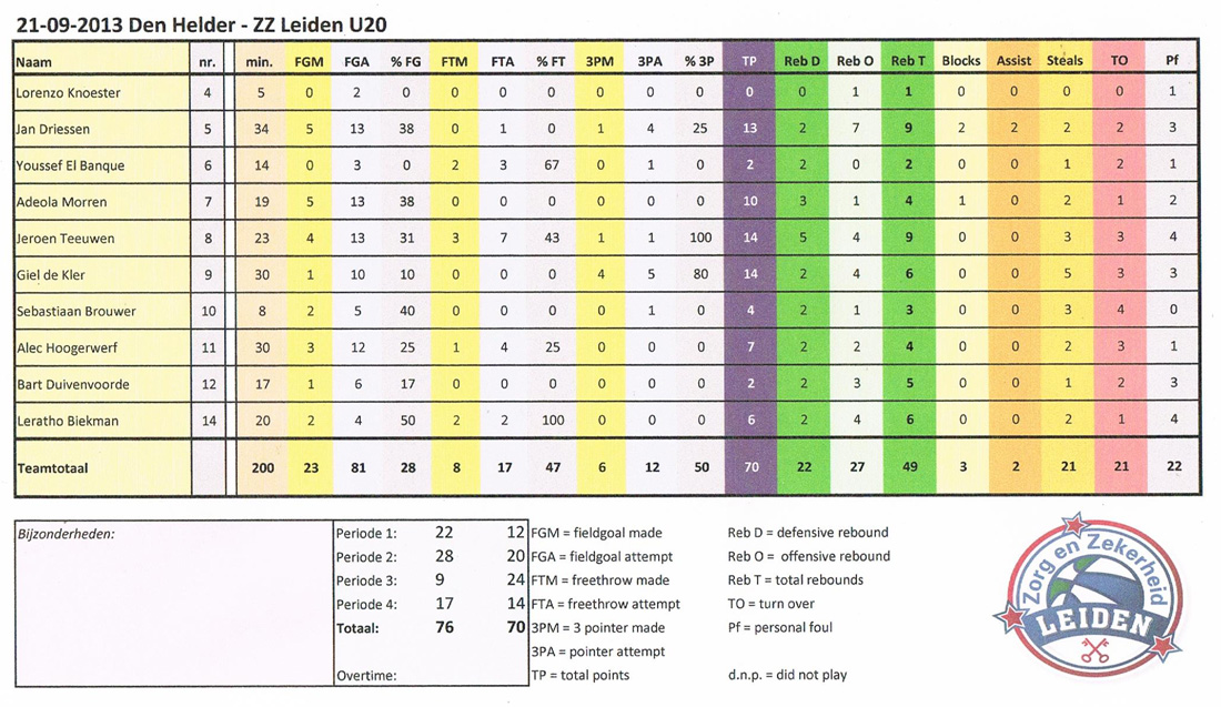 De laatste tien minuten van de wedstrijd beginnen niet goed aan Leidse kant. Dankzij twee missers van dichtbij en twee maal onnodig balverlies loopt de score via 65-56 op naar 74-62. ZZ geeft niet op en blijft hard werken. Helaas blijkt de wedstrijd net te kort te duren, want bij 76-70 klinkt het eindsignaal.