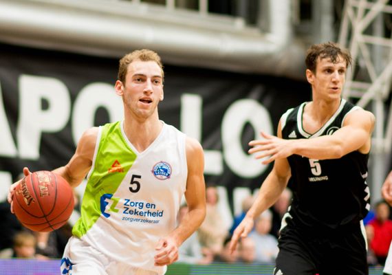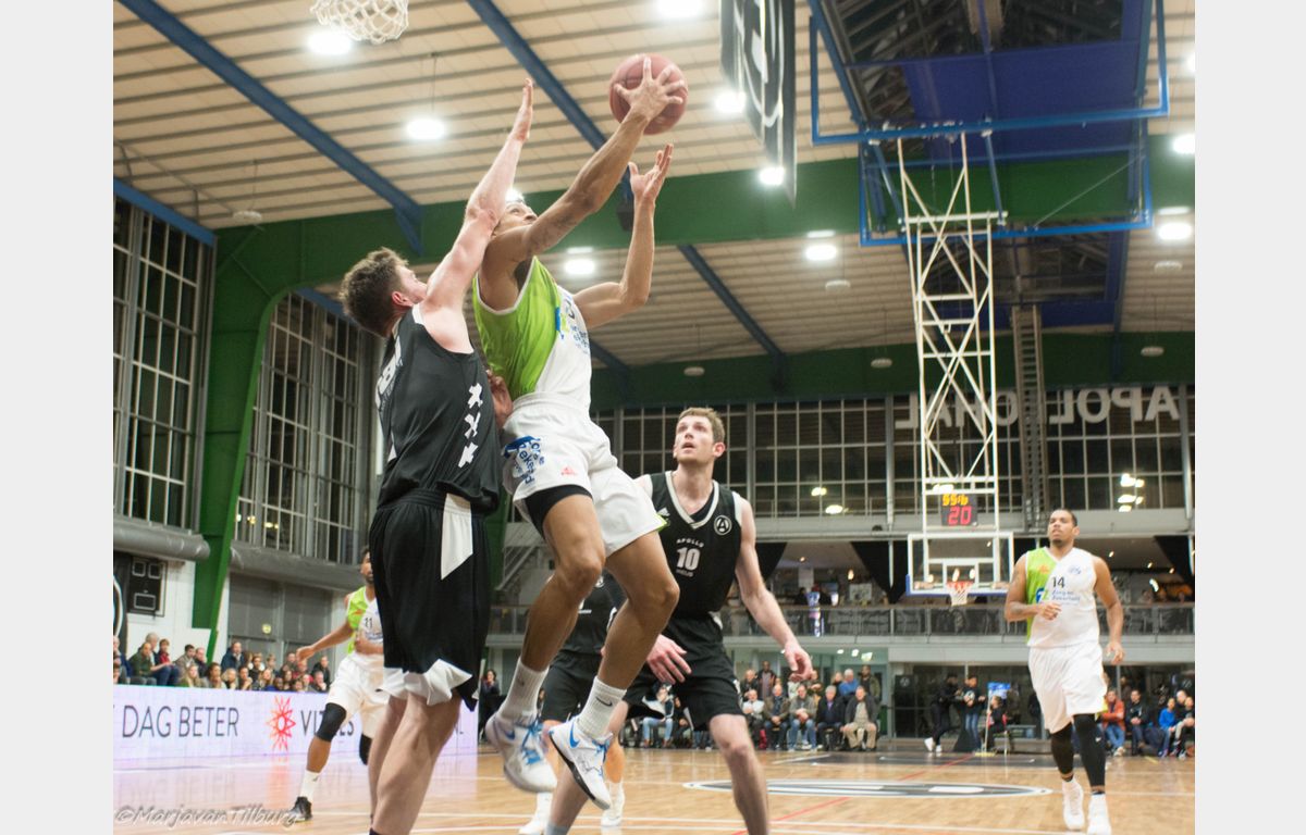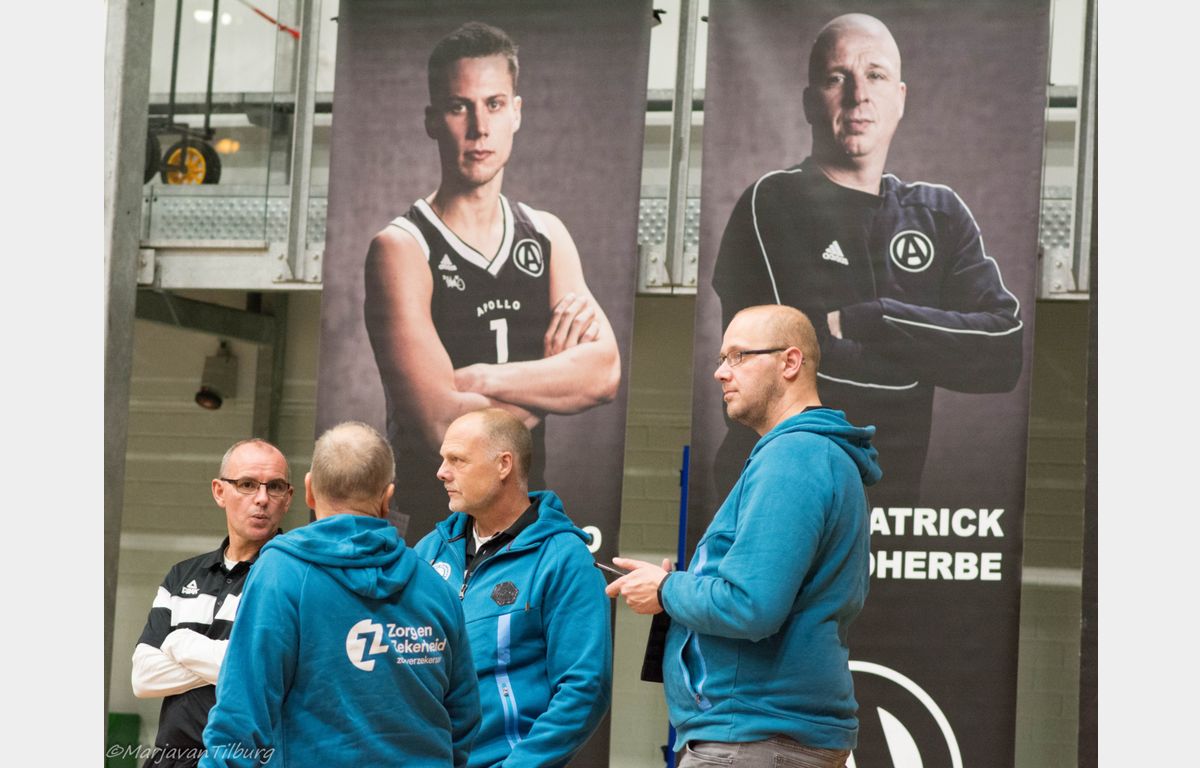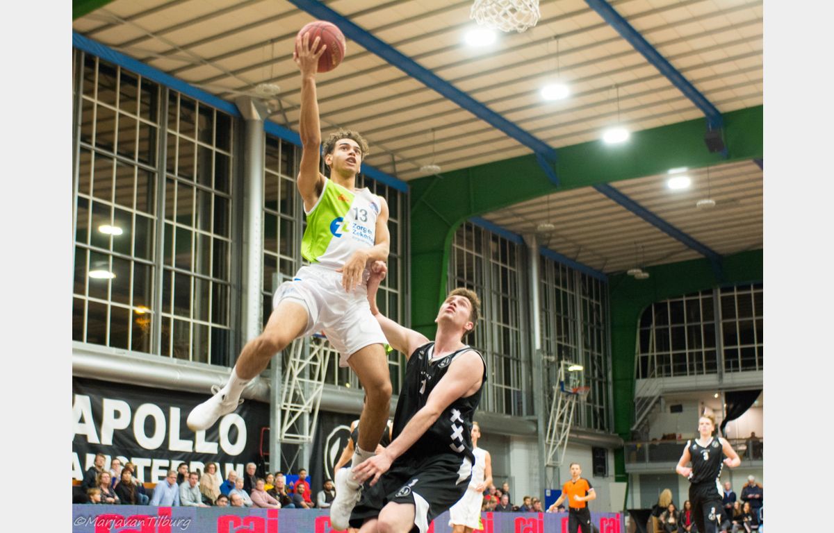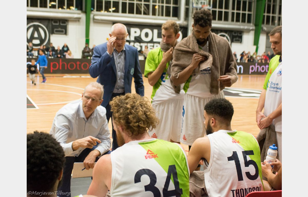 Misschien wat overmoedig begon Zorg en Zekerheid Leiden, dat nog geen 24 uur eerder uit Roemenië was teruggekeerd, aan het duel. Gesteund door een grote schare fans die de reis naar Amsterdam hadden ondernomen. Zij keken verbaasd op dat het na twee minuten spelen 8-0 voor Apollo stond. Clayton Vette en Worthy de Jong waren vervolgens actief voor de Leidse ploeg. Even plaatste Zorg en Zekerheid Leiden een 8-0 run met onder meer een dunk van Darius Thompson over Berend Weijs heen: 13-17. Dunken kan Weijs natuurlijk ook en dat zou hij maar liefst vier keer doen. Hij bracht zijn ploeg nog terug tot 18-18, maar het eindschot was voor Marijn Ververs en een dunk van Mohamed Kherrazi: 18-24. In de laatste aanval ging Dimeo van der Horst door zijn enkel en kon niet meer verder spelen. Zo bleven er voor de coaches Patrick Faijdherbe en zijn assistent Rogier Jansen nog zes spelers over. Dezelfde zes die zondag naar de Vijf Meihal moeten, aldus Faijdherbe.
