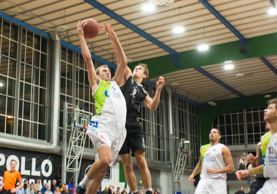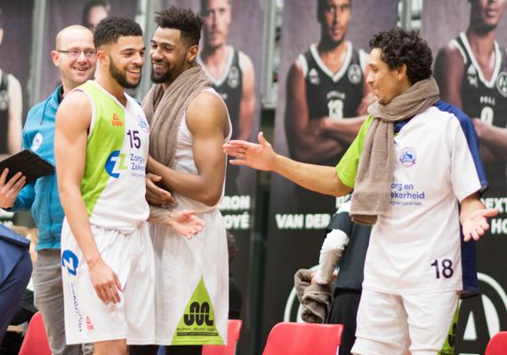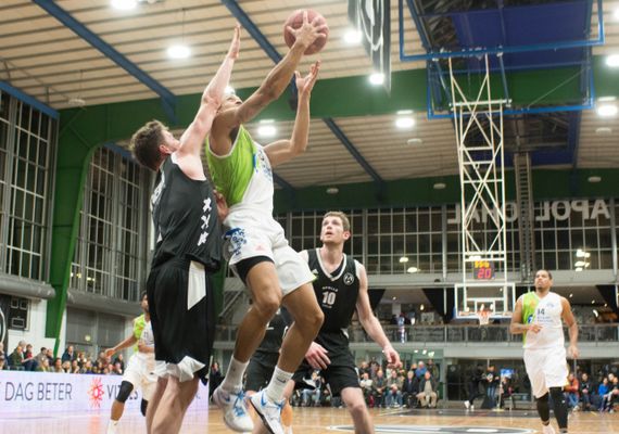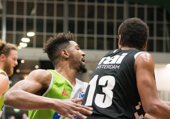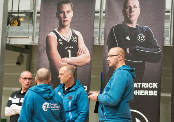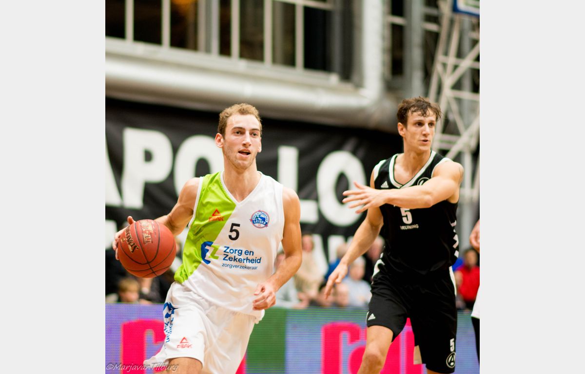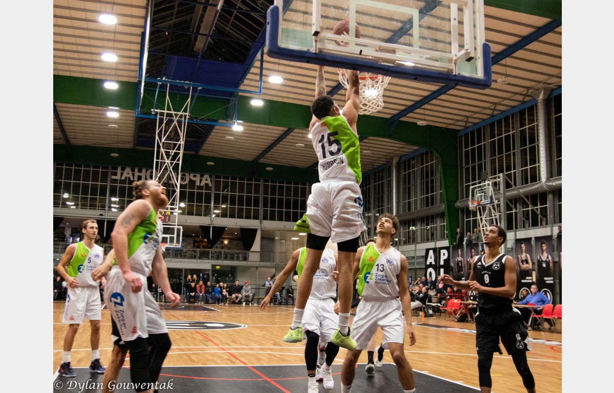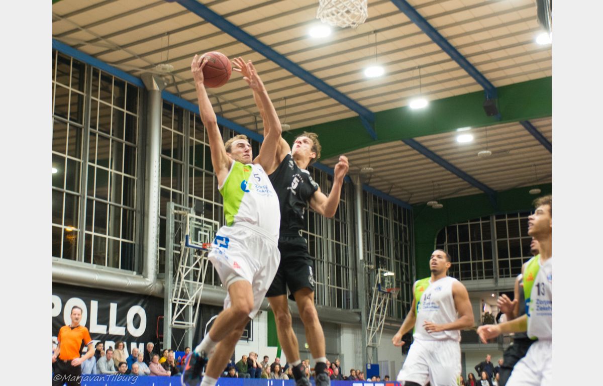 Misschien wat overmoedig begon Zorg en Zekerheid Leiden, dat nog geen 24 uur eerder uit Roemenië was teruggekeerd, aan het duel. Gesteund door een grote schare fans die de reis naar Amsterdam hadden ondernomen. Zij keken verbaasd op dat het na twee minuten spelen 8-0 voor Apollo stond. Clayton Vette en Worthy de Jong waren vervolgens actief voor de Leidse ploeg. Even plaatste Zorg en Zekerheid Leiden een 8-0 run met onder meer een dunk van Darius Thompson over Berend Weijs heen: 13-17. Dunken kan Weijs natuurlijk ook en dat zou hij maar liefst vier keer doen. Hij bracht zijn ploeg nog terug tot 18-18, maar het eindschot was voor Marijn Ververs en een dunk van Mohamed Kherrazi: 18-24. In de laatste aanval ging Dimeo van der Horst door zijn enkel en kon niet meer verder spelen. Zo bleven er voor de coaches Patrick Faijdherbe en zijn assistent Rogier Jansen nog zes spelers over. Dezelfde zes die zondag naar de Vijf Meihal moeten, aldus Faijdherbe.