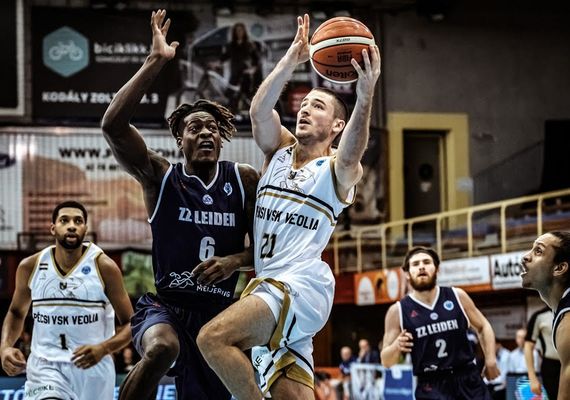 Zorg en Zekerheid Leiden is er niet in geslaagd om de uitwedstrijd tegen PVSK-Veolia in winst om te zetten. De thuisploeg sloeg in het eerste kwart al een gaatje. In het derde kwart kreeg de Leidse ploeg kansen genoeg om naast de Hongaren te komen, alleen werden die niet benut. In het laatste kwart stelde PVSK-Veolia de eerste winst veilig: 87-77.