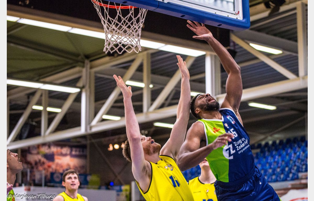 Wie na de pauze een ander spelbeeld zou verwachten, kwam aanvankelijk bedrogen uit. Even leek Zorg en Zekerheid Leiden het lek boven te hebben (and-1 van Marijn Ververs en scores van Finke en Nzekwesi), maar de 53-48 voorsprong ging snel weer in rook op. Een mooi moment was een alley-oop pass van Worthy de Jong naar een dunkende Nzekwesi. Na driepunters op rij van Kovac en Bolden Brace was het na negen minuten spelen in het derde kwart gewoon weer 60-64. Via een and-1 en een dunk van Nzekwesi, die na de pauze 25 van zijn 33 punten liet aantekenen, was het vlak voor het einde van het kwart 65-64. Het laatste woord was echter aan Brace die met een driepunter 65-67 op de borden schoot.