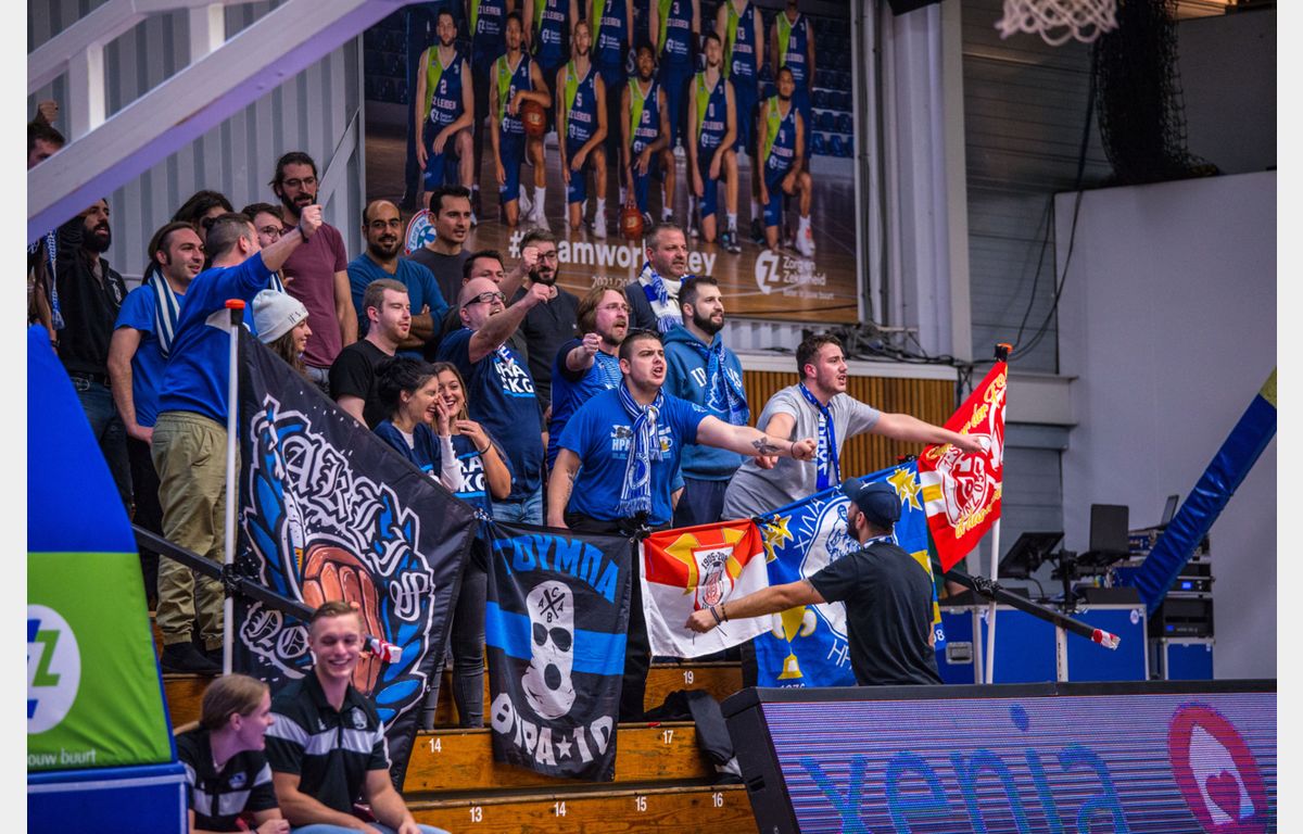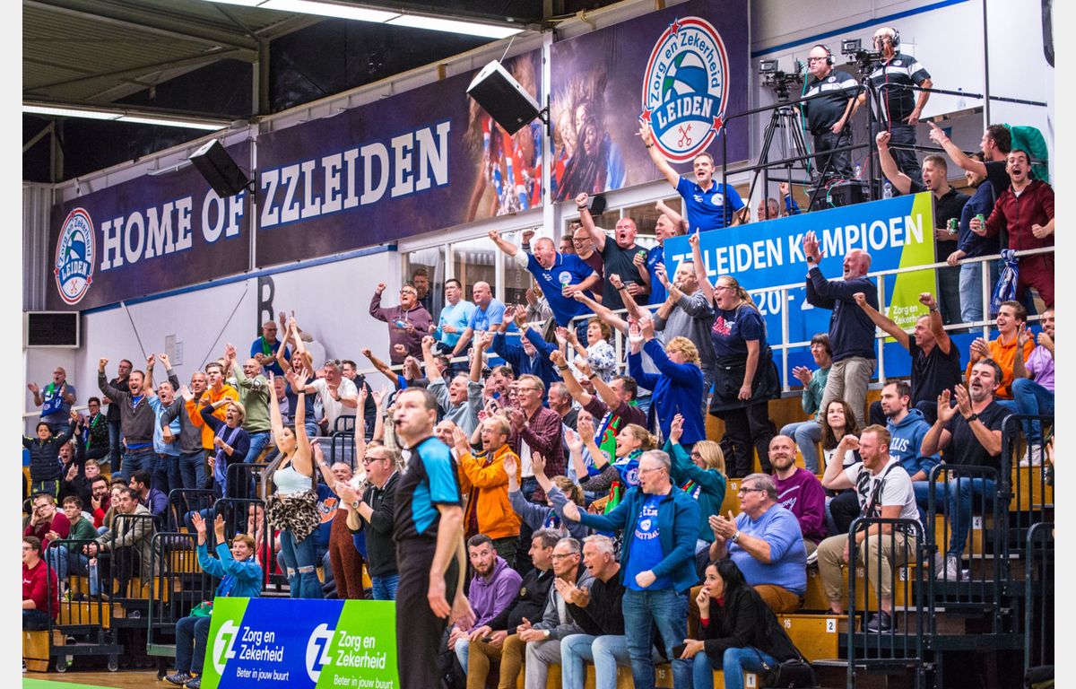 Het waren Zuid-Europese taferelen in de Vijf Meihal. Twee tribunes werden bevolkt door Griekse fans, van wie sommigen hun bovenkleding meteen uit hadden getrokken. Met liederen en het steeds sneller wordende handengeklap moedigden zij hun ploeg aan. De Leidse fans lieten zich echter ook niet onbetuigd en dat leidde tot een uitstekende ambiance.