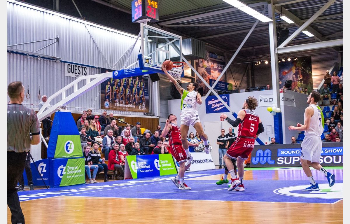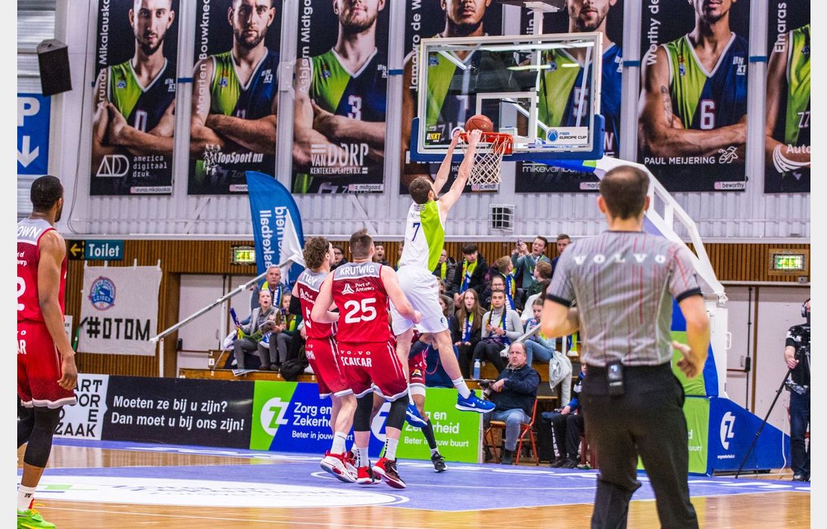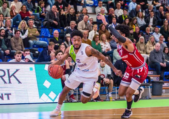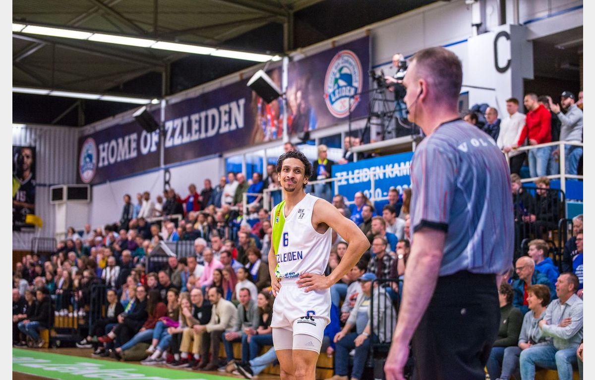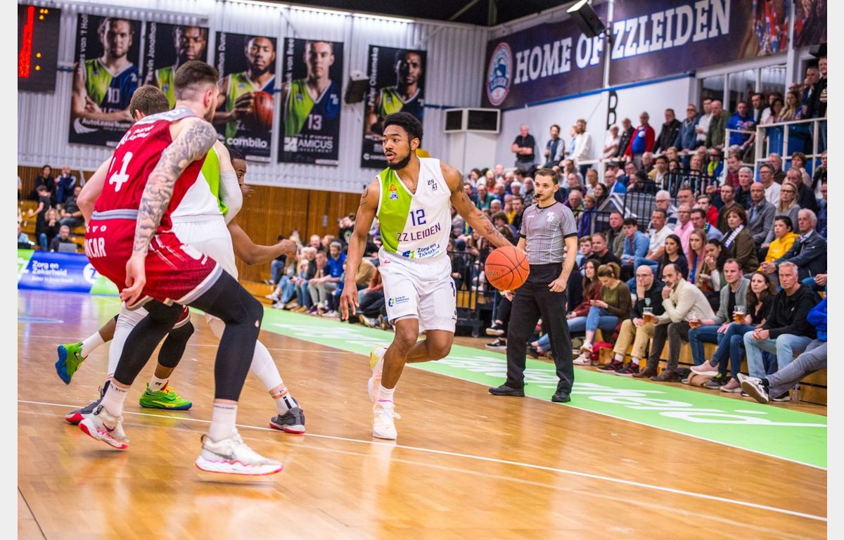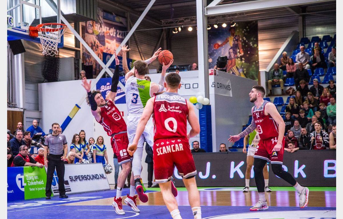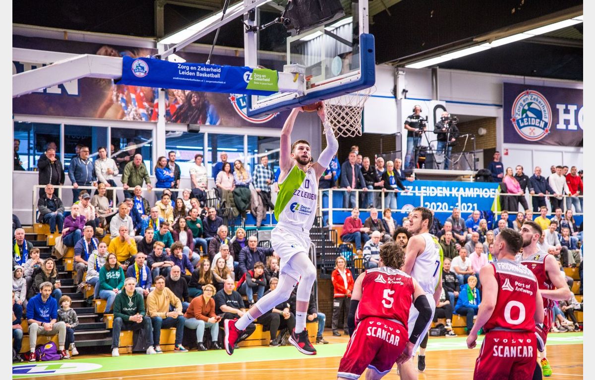 De Jong werd met 18 punten (allemaal na rust gemaakt) topscorer bij Zorg en Zekerheid Leiden. Tubutis en Dunn (6 assists) kwamen allebei tot 15 punten. Midtgaard kwam niet verder dan vier punten, maar pakte wel 13 rebounds en blockte vijf schoten. Volgende week zaterdag staat de return op het programma.