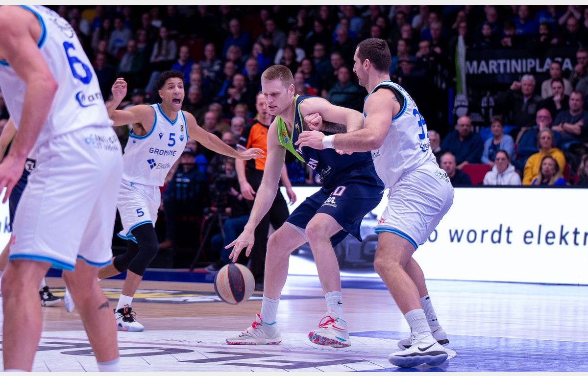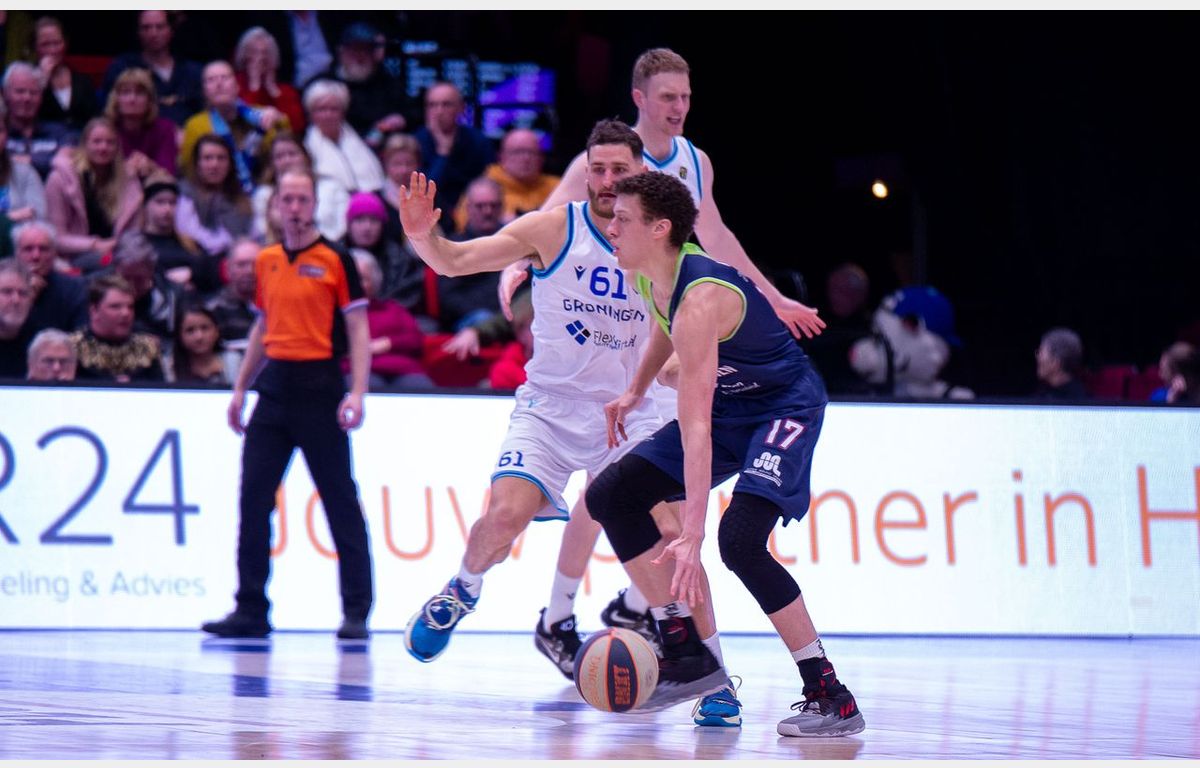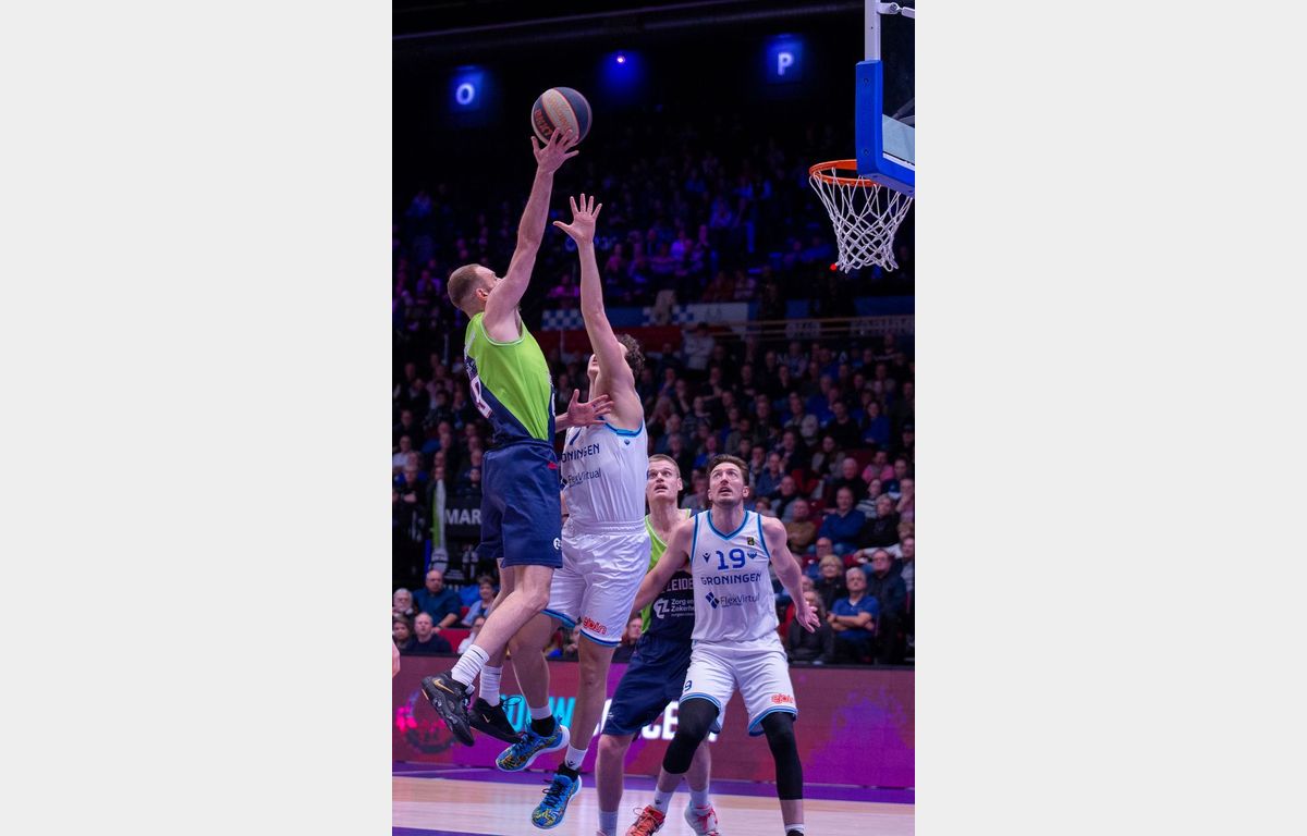 Via scores van Maarten Bouwknecht en Deion Hammond pakte Zorg en Zekerheid Leiden aan het begin van het tweede kwart een voorsprong van vijf punten, maar dat was geen lang leven beschoren. Twee rake vrije worpen van Thomas Rutherford bepaalden een ruststand van 37-36 in Gronings voordeel.